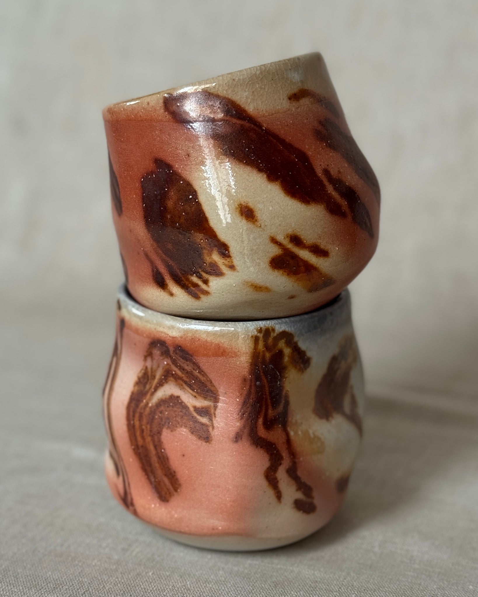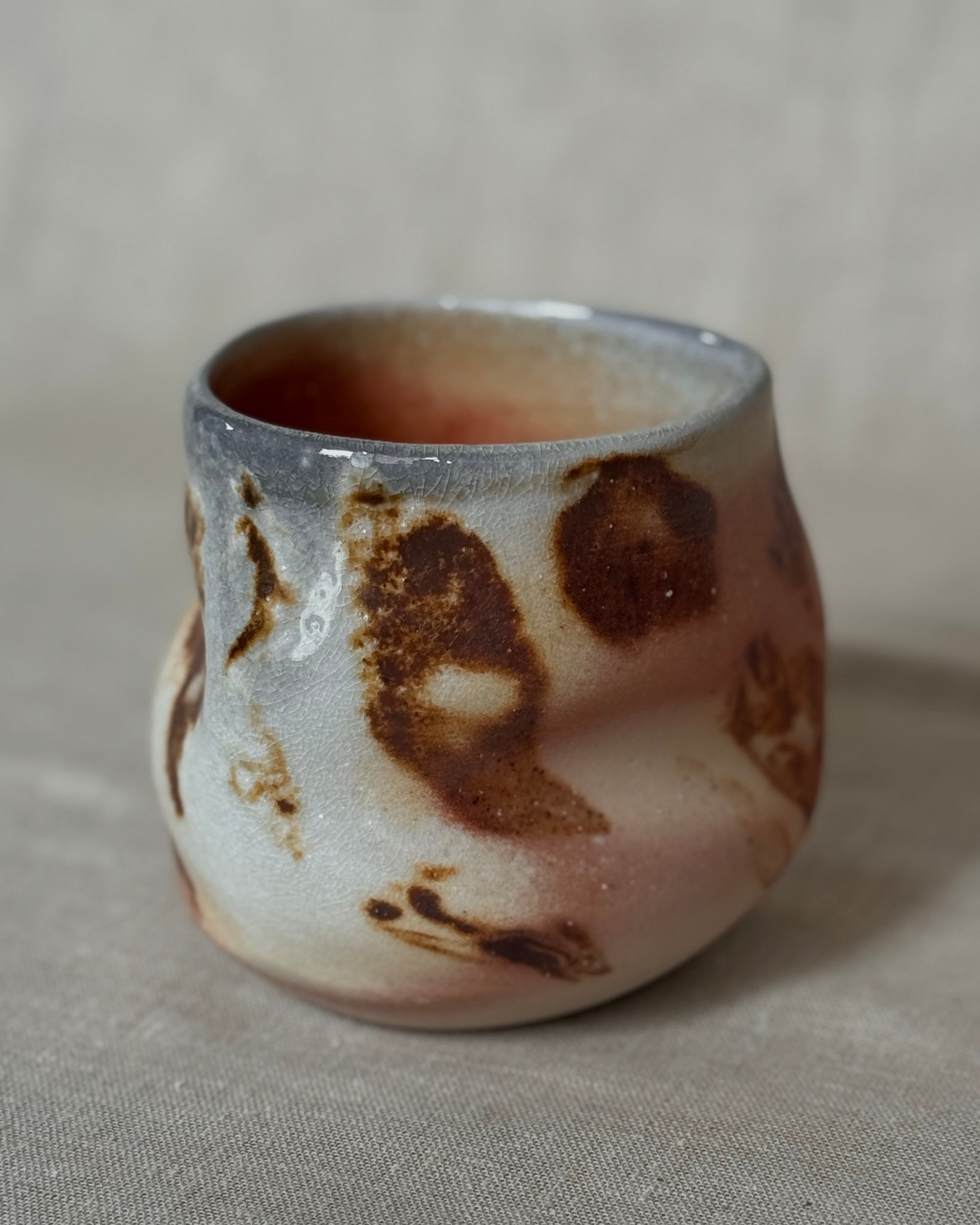 This piece was fired in a Catenary wood/soda kiln for 40 hours. Wood is fed into the kiln every five to ten minutes to keep the temperature inside climbing. The introduction of soda and ash from the burning wood flies through the kiln landing on pieces to create beautiful and unique colours. This makes each piece individual and irreplaceable