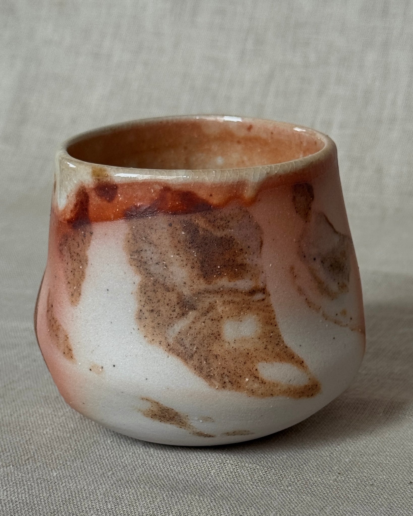 White Australian stoneware clay with dark brown clay marbled through. A Shino glaze lines the inside of the piece and the raw clay has been sanded to a smooth finish on the outside