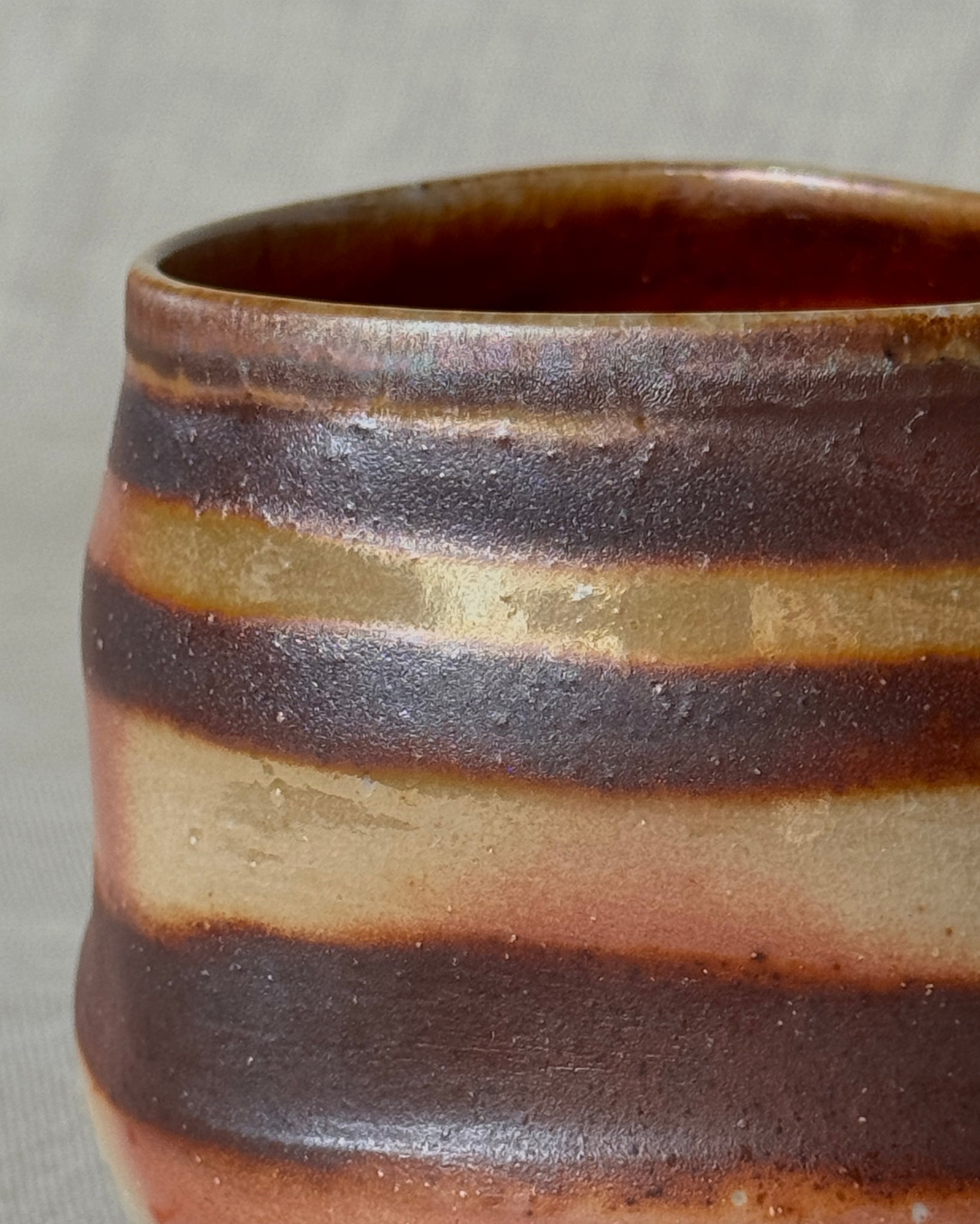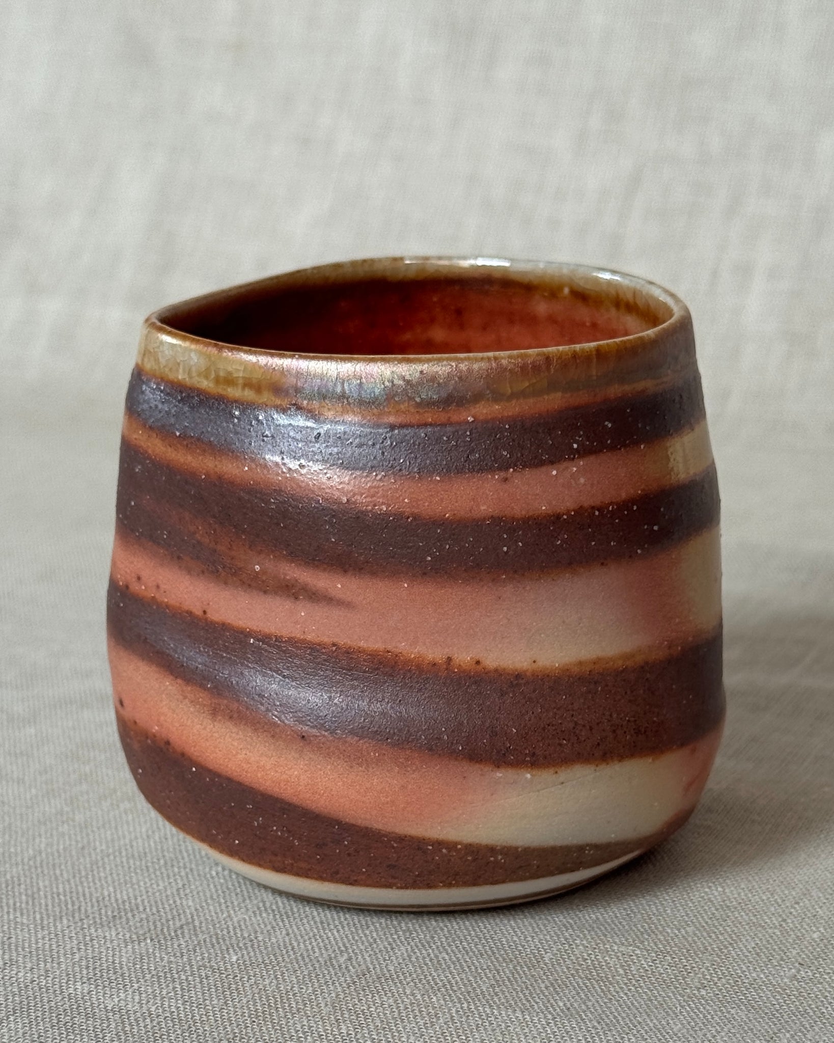 Woodfired ceramic cup made from marbled clay  on a linen background